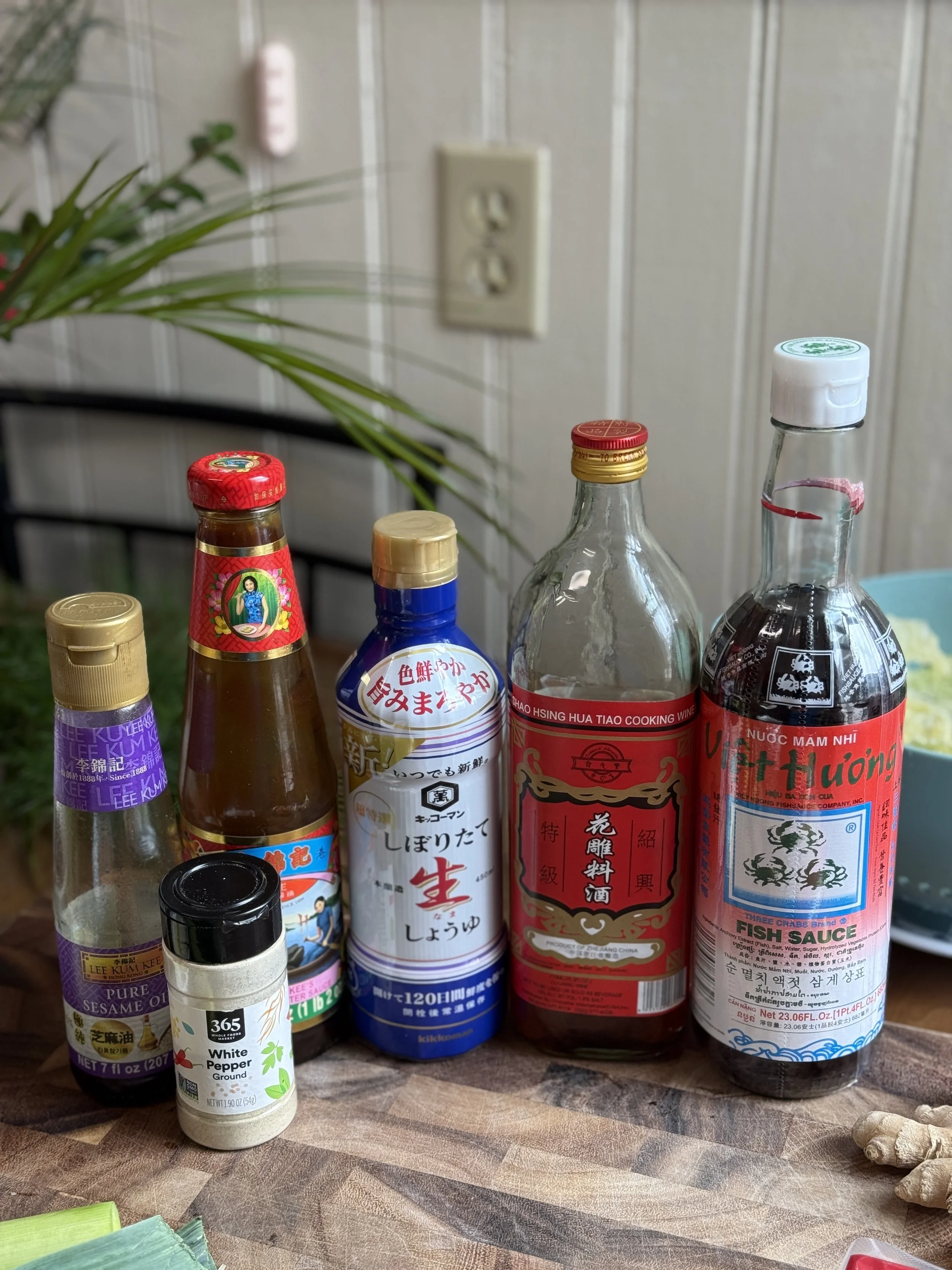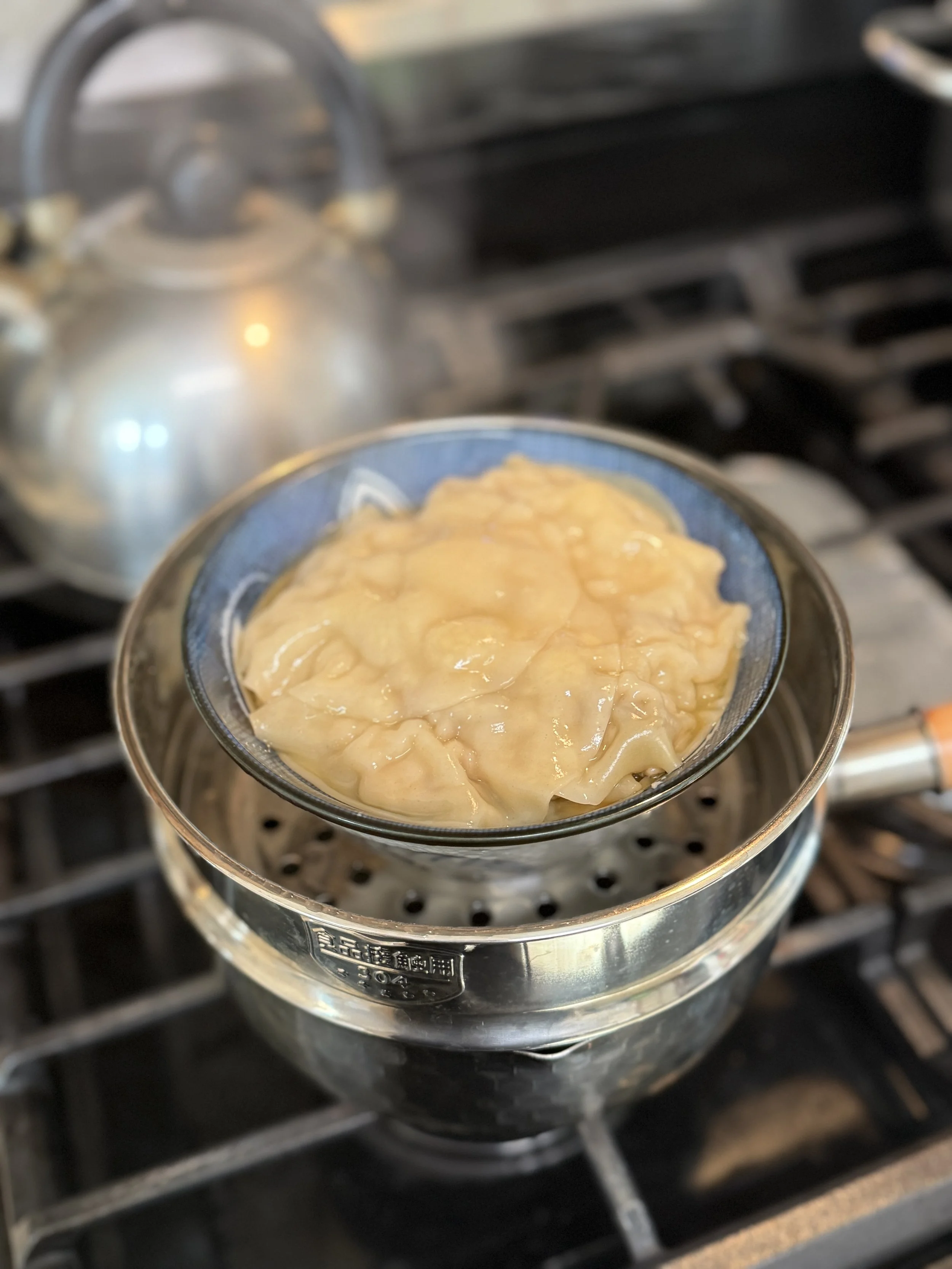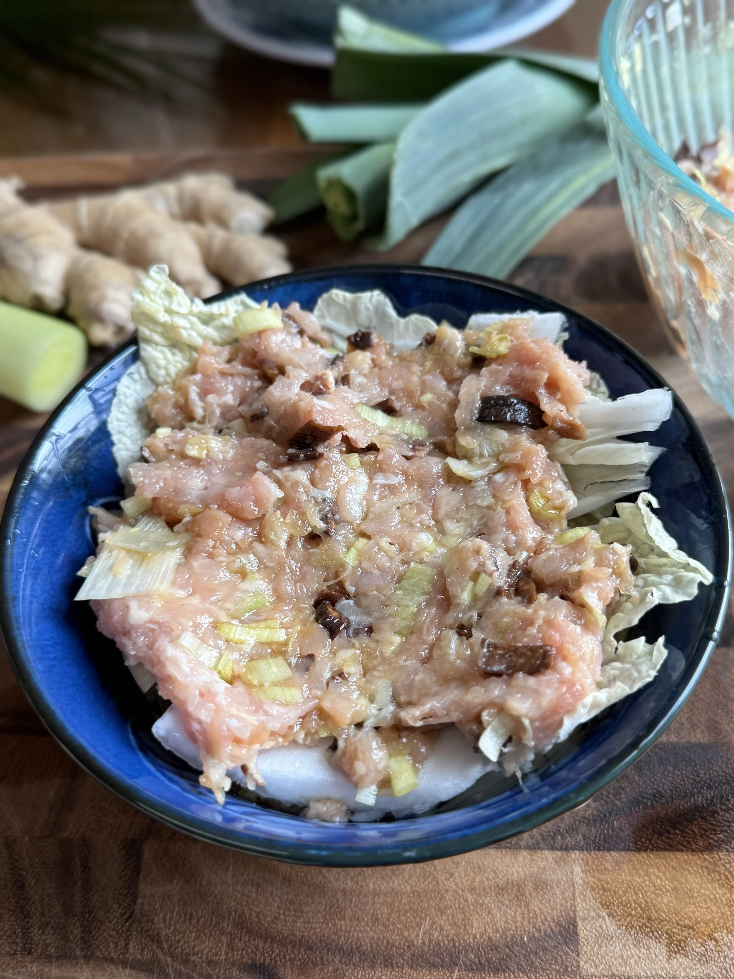 In a separate bowl or steamer dish, layer cabbage and the ground chicken mixture, repeating until filled. Finish with a layer of dumpling wrappers on top.