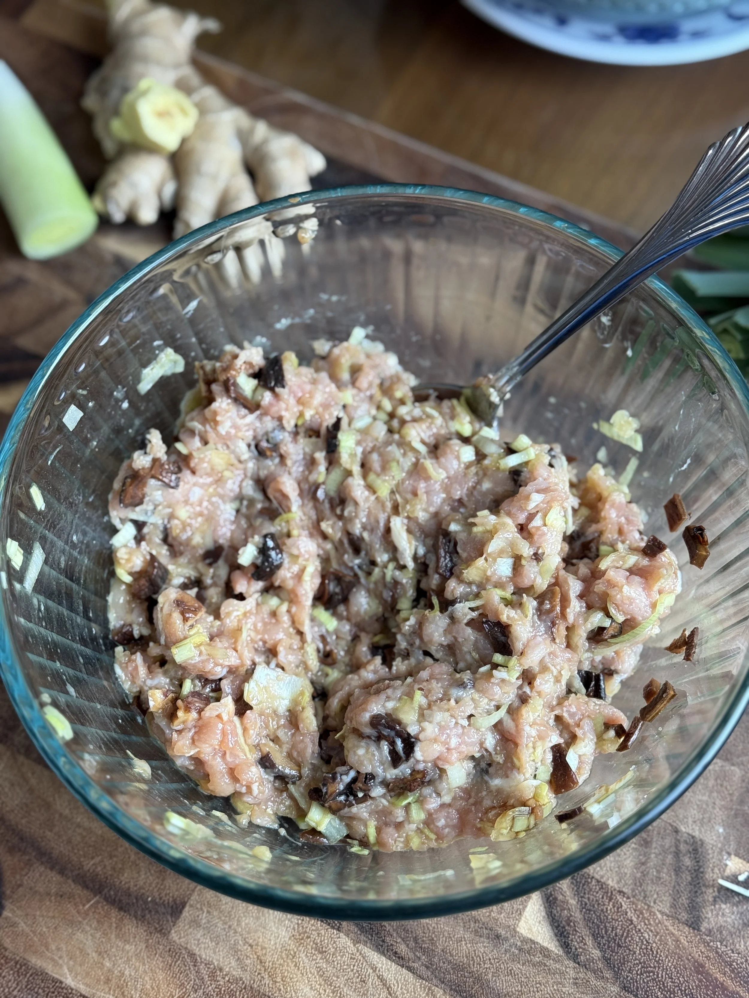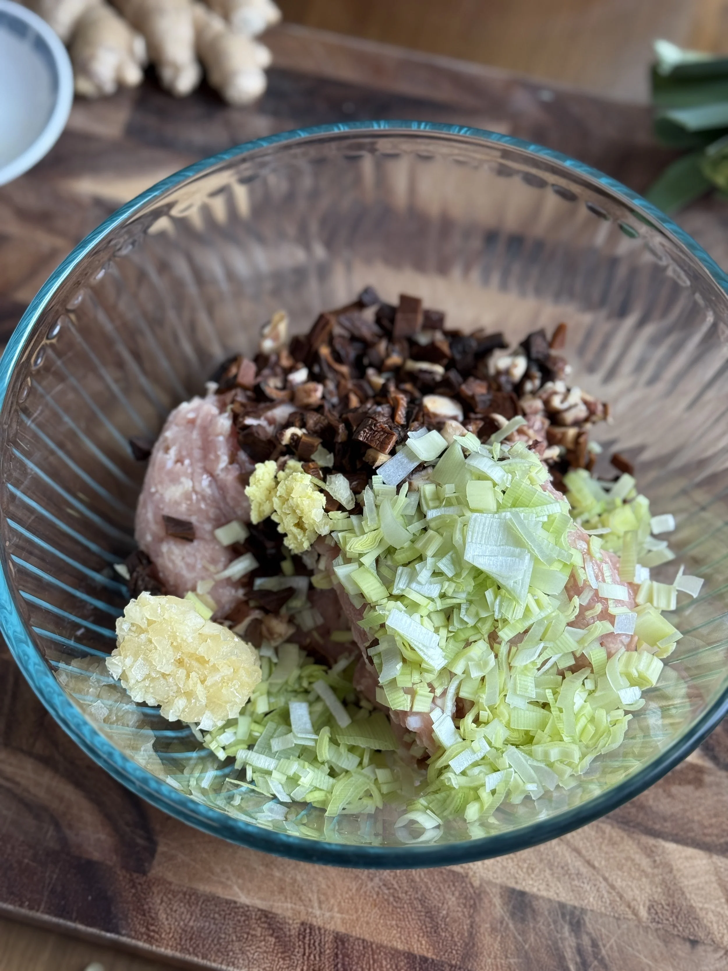 In a large bowl, combine the ground chicken, chopped mushrooms, leeks, and seasonings. Mix until evenly incorporated.